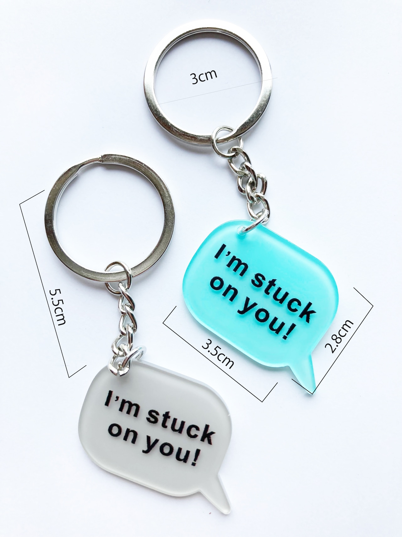 ぷっくりした吹き出し型に、キャッチーなメッセージが映えるアクリルキーホルダー
